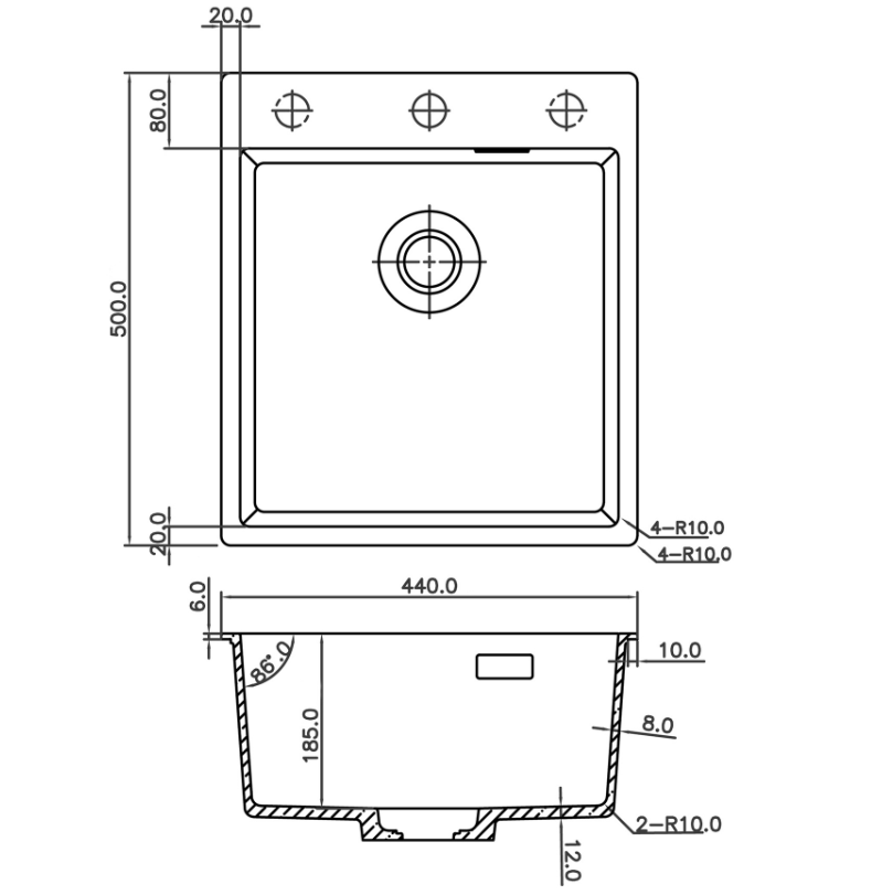 Lorreine 40BQSP-FU-Inox Luxe Enkele Keukenspoelbak Graniet Zwart Met Korfplug RVS 40 x 40 Vlakbouw Of Onderbouw