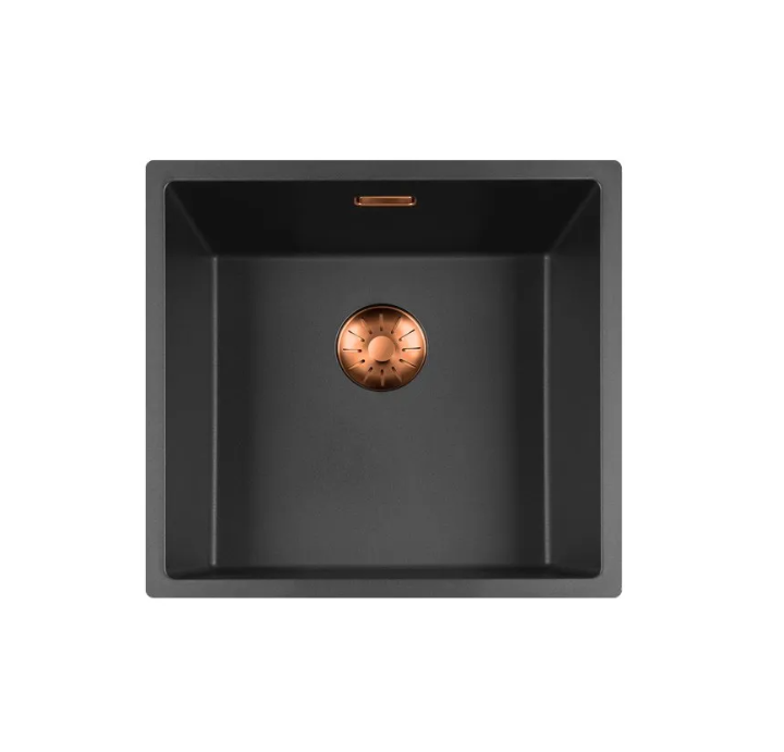 Lorreine 40BQSP-FU-Copper Luxe Enkele Keukenspoelbak Graniet Zwart Met Korfplug Copper 40 x 40 Vlakbouw Of Onderbouw
