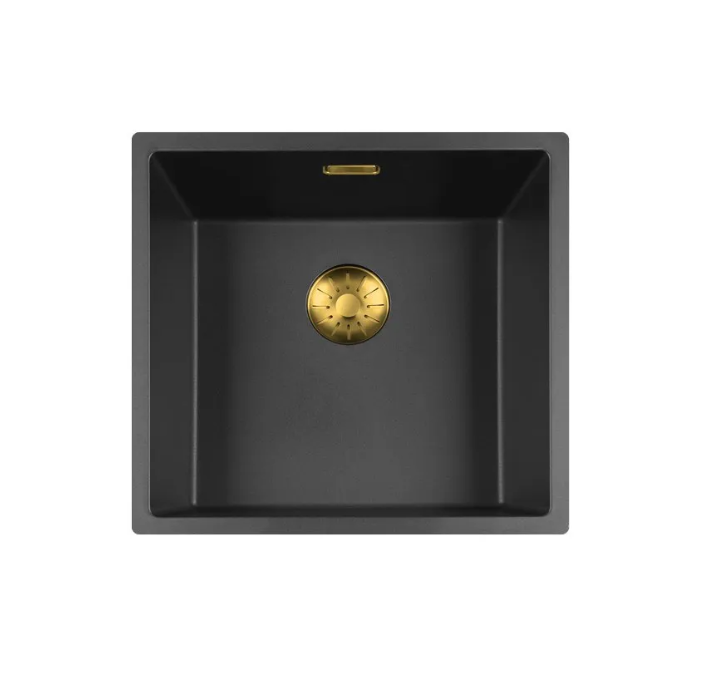 Lorreine 40BQSP-FU-Gold Luxe Enkele Keukenspoelbak Graniet Zwart Met Korfplug Goud 40 x 40 Vlakbouw Of Onderbouw