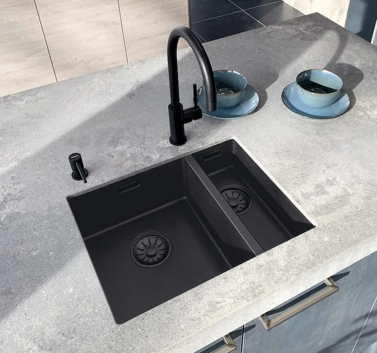 Caressi Quartz CAQPP40KR10BK-EB Keukenspoelbak Graniet Mat Zwart Met Kraangat Met Zwarte Korfplug Opbouw