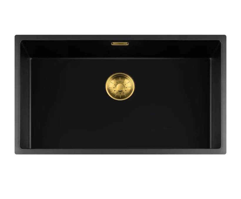 Lorreine 74BQ-FU-Gold Luxe Enkele Keukenspoelbak Graniet Zwart Met Korfplug Goud 74 x 40 Vlakbouw Of Onderbouw