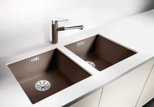 Inclusief snijplank in veiligheidsglas, multifunctioneel inzetbakje in rvs, plaatsbesparend afloopgarnituur, InFino korfventielen 3 ½” met draaiknopbediening op de hoofdbak