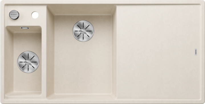 Inclusief snijplank in essenhout-compound, multifunctioneel inzetbakje in rvs, plaatsbesparend afloopgarnituur, InFino® korfventielen 3 ½” met draaiknopbediening op de hoofdbak