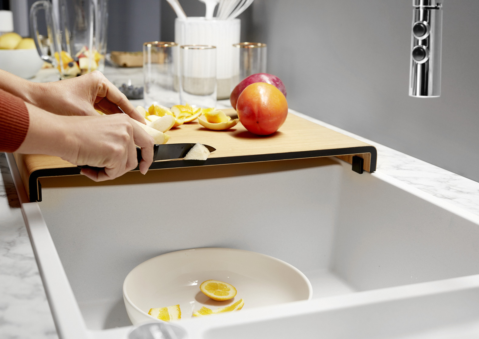 Snijplank in essenhout-compound, plaatsbesparend afloopgarnituur, InFino korfventiel 3 ½” met draaiknopbediening