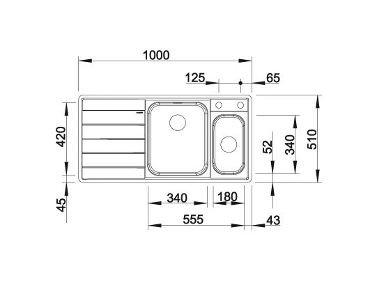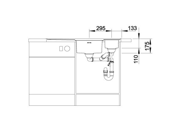 Inclusief snijplank in notelaarhout, multifunctioneel inzetbakje en schaaltje in roestvrij staal passen ook in de hoofdbak, plaatsbesparend afloopgarnituur, 2 x InFino korfventiel 3 ½”, met draaiknopbediening voor de hoofdbak