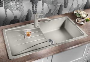 Inclusief geperforeerd inzetbakje in roestvrij staal, plaatsbesparend afloopgarnituur, 2 x 3 ½” en 1 ½” InFino korfventiel 3 ½ met afloopbediening draaiknop voor de hoofdbak