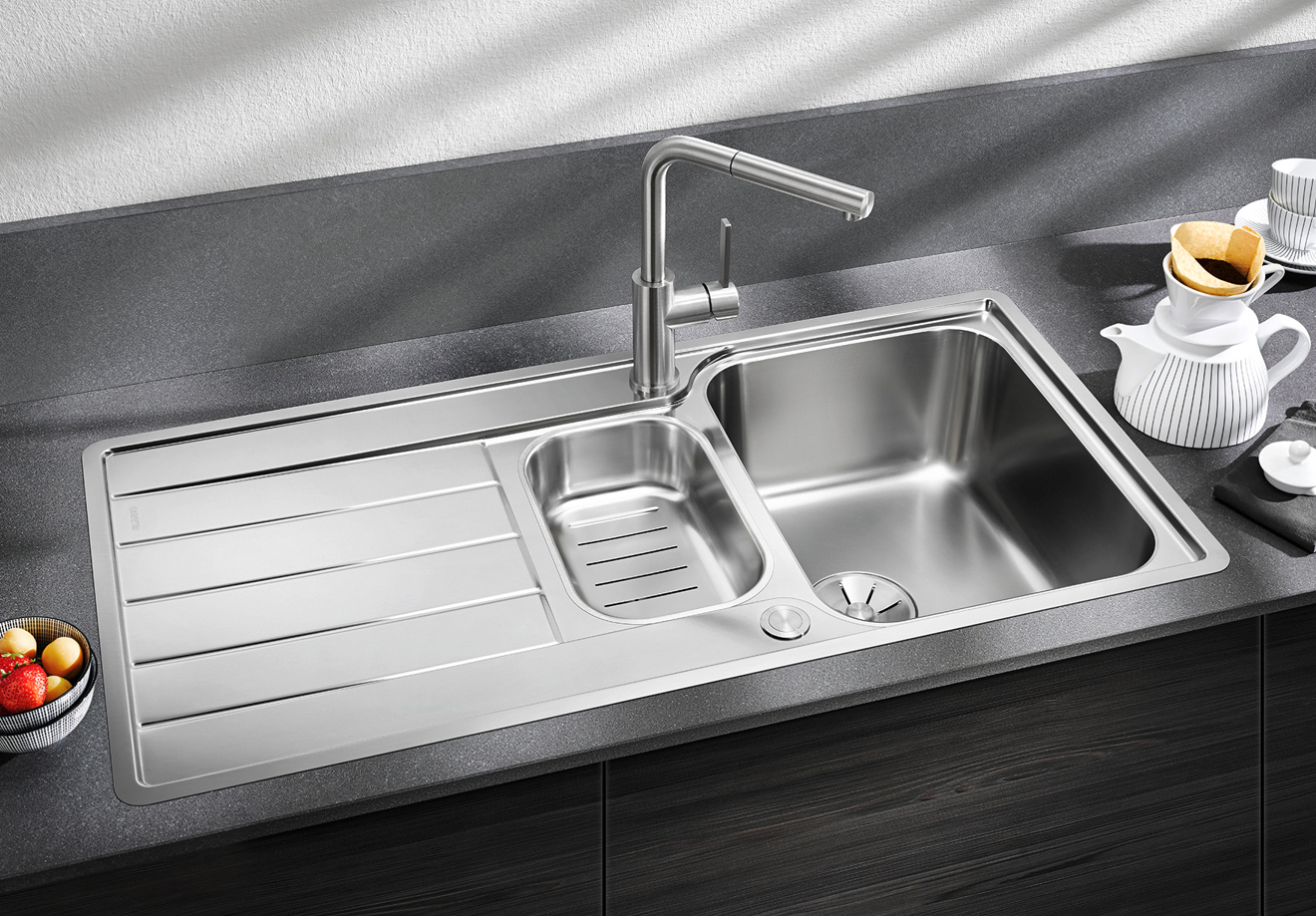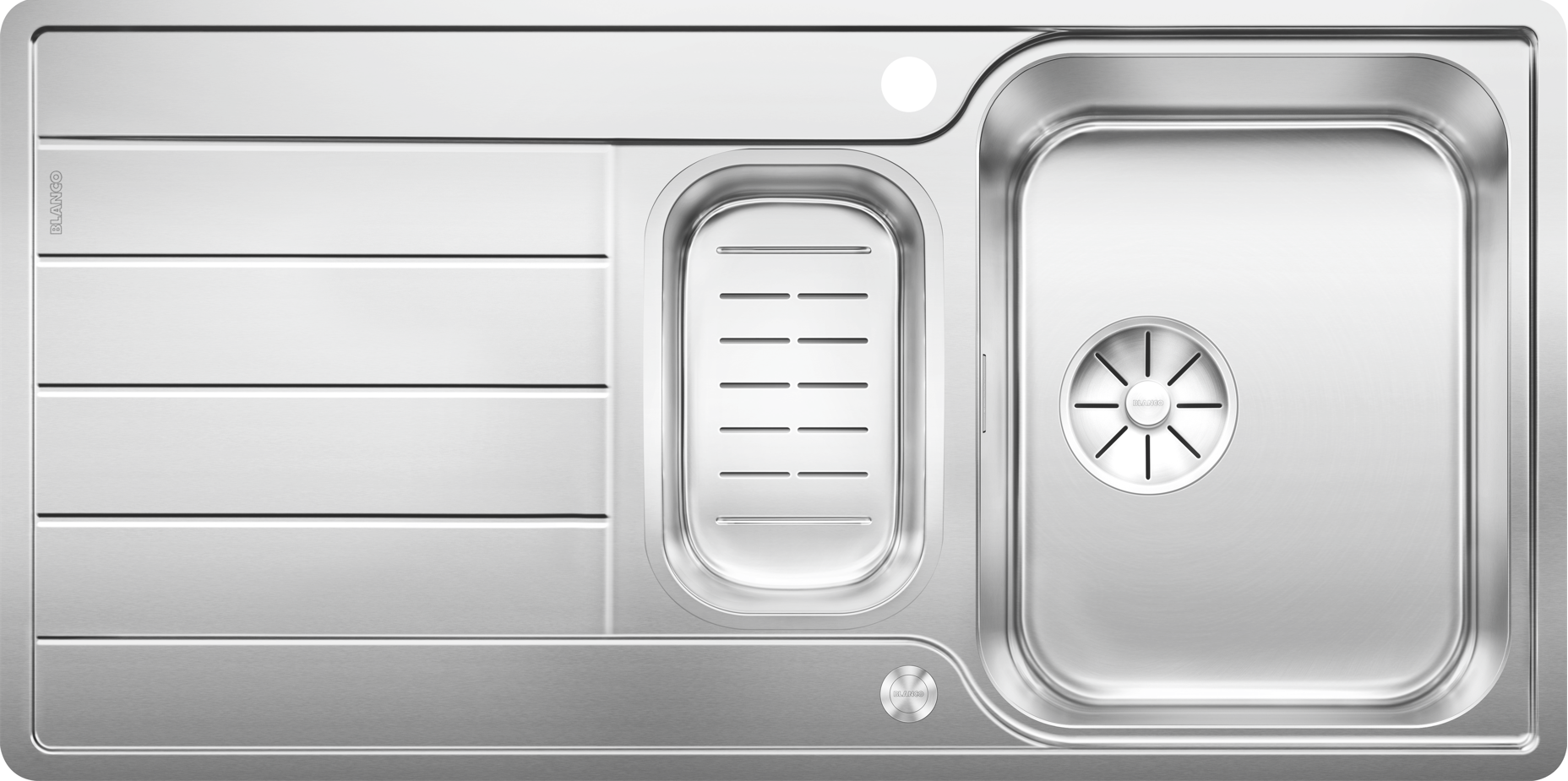 Hoogwaardige afwerking met verdekte C – overflow overloop en Blanco InFino afloopsysteem – met de vlakke en innovatieve PushControl afloopbediening