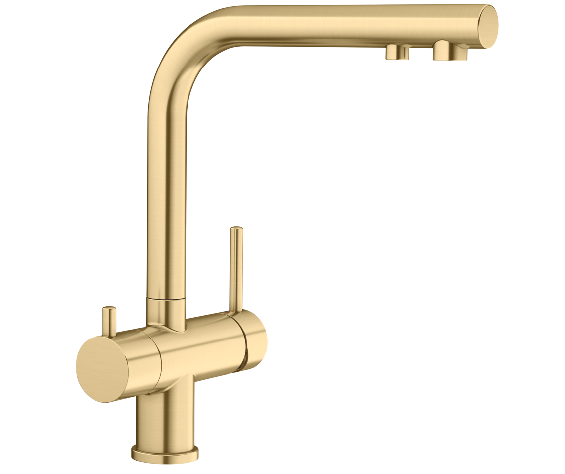 Comfortabele 3-in-1 mengkraan met bedieningshendel voor koud en warm water aan rechterzijde en bedieningshendel voor gefilterd water aan linkerzijde