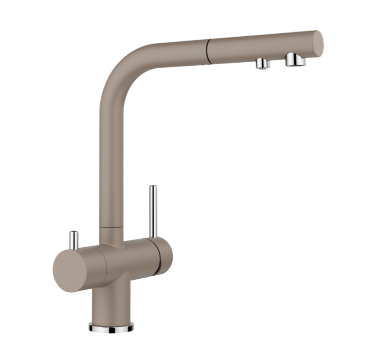 Comfortabele 3-in-1 mengkraan met bedieningshendel voor koud en warm water aan rechterzijde en bedieningshendel voor gefilterd water aan linkerzijde