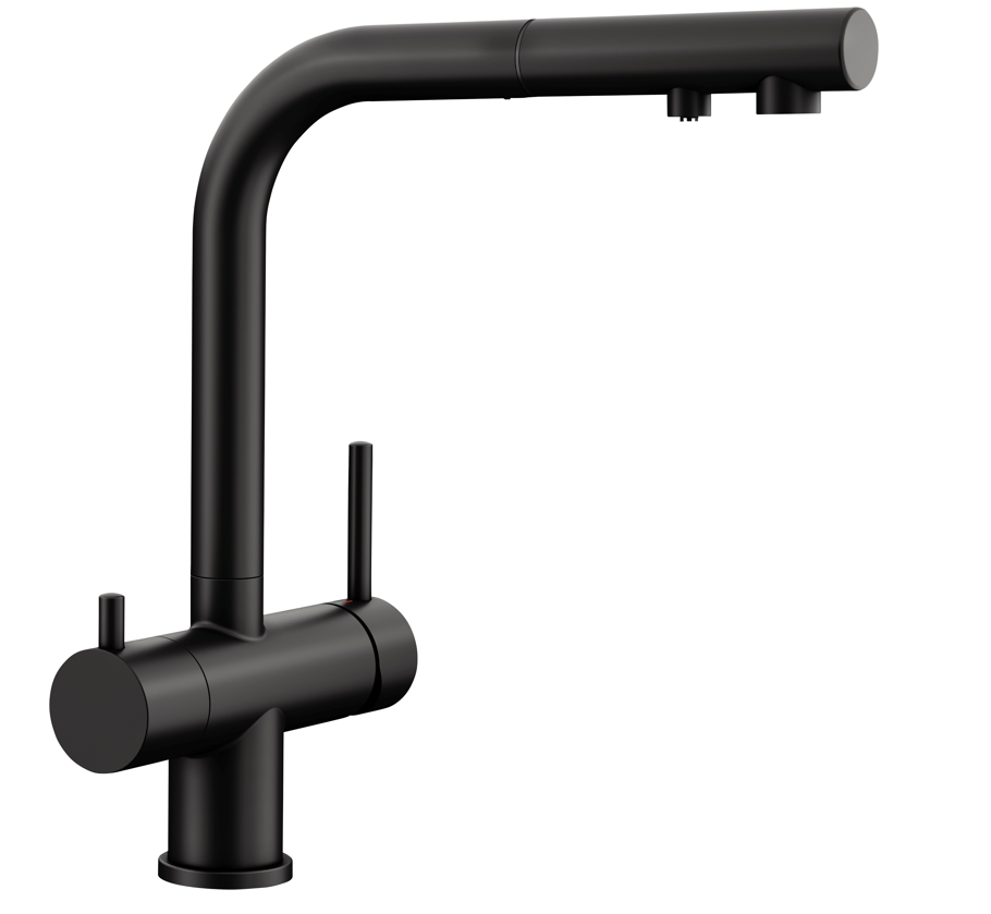 Comfortabele 3-in-1 mengkraan met bedieningshendel voor koud en warm water aan rechterzijde en bedieningshendel voor gefilterd water aan linkerzijde