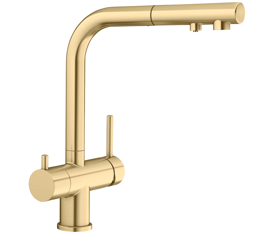 Comfortabele 3-in-1 mengkraan met bedieningshendel voor koud en warm water aan rechterzijde en bedieningshendel voor gefilterd water aan linkerzijde