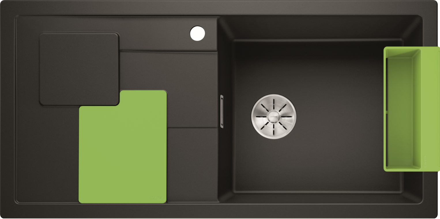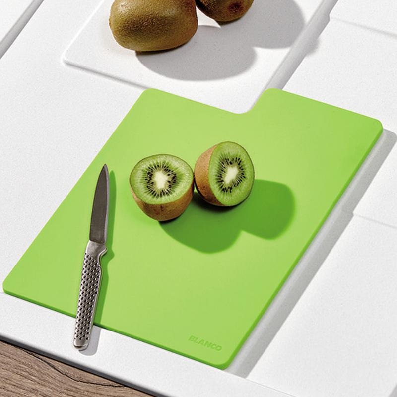 Set accessoires die qua vorm en functie perfect afgestemd zijn op de spoelbak: variabel positioneerbare, flexibele snijplank SITYPad en ophangbare schaal SITYBox