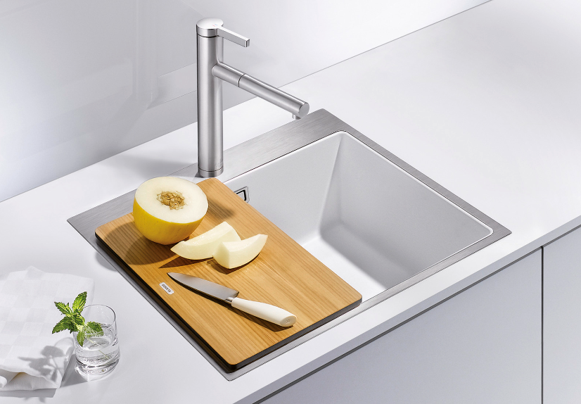 Elegant vormgegeven spoelbak met geïntegreerde kraanrichel in slechts een uitsparing in het werkblad