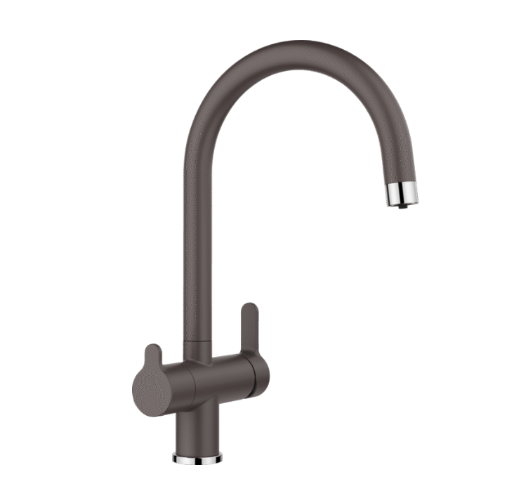 Comfortabele 3 in 1 mengkraan met bedieningshendel voor koud en warm water aan rechterzijde en bedieningshendel voor gefilterd water aan linkse zijde