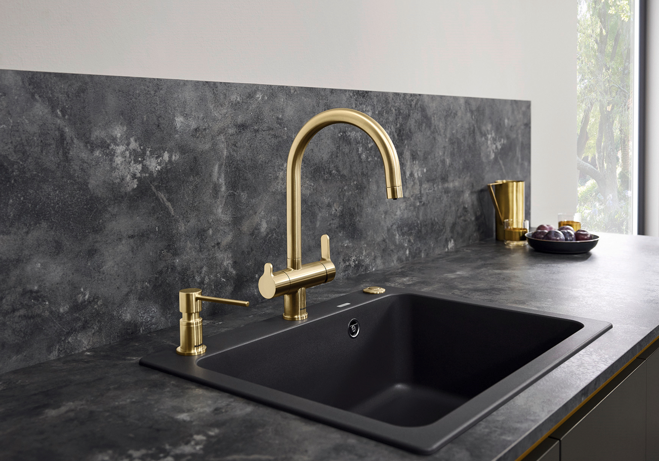 Comfortabele 3 in 1 mengkraan met bedieningshendel voor koud en warm water aan rechterzijde en bedieningshendel voor gefilterd water aan linkse zijde