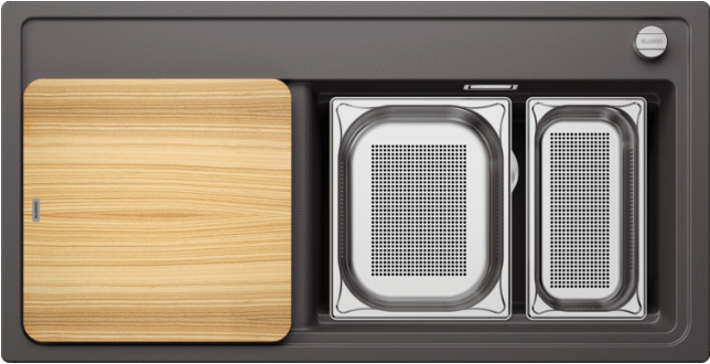 Inclusief snijplank in essenhout-compound, geperforeerde GN 1/3 bak, geperforeerde GN ½ bak, plaatsbesparend afloopgarnituur, InFino korfventiel 3 ½‘‘, met draaiknopbediening