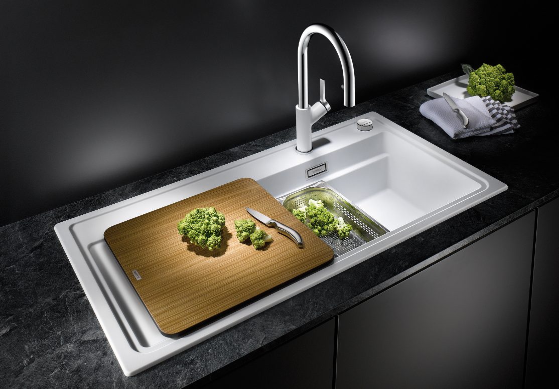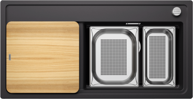 Inclusief snijplank in essenhout-compound, geperforeerde GN 1/3 bak, geperforeerde GN ½ bak, plaatsbesparend afloopgarnituur, InFino korfventiel 3 ½‘‘, met draaiknopbediening