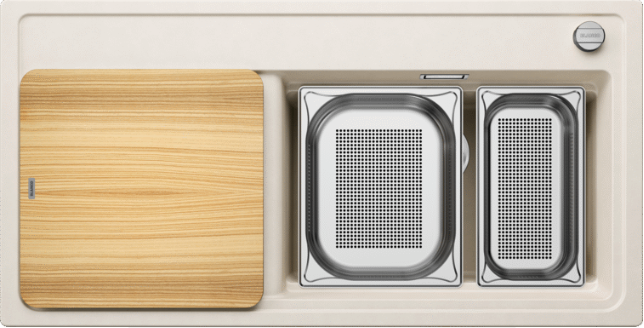 Inclusief snijplank in essenhout-compound, geperforeerde GN 1/3 bak, geperforeerde GN ½ bak, plaatsbesparend afloopgarnituur, InFino korfventiel 3 ½‘‘, met draaiknopbediening