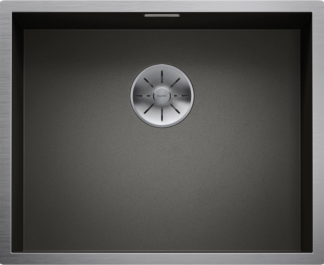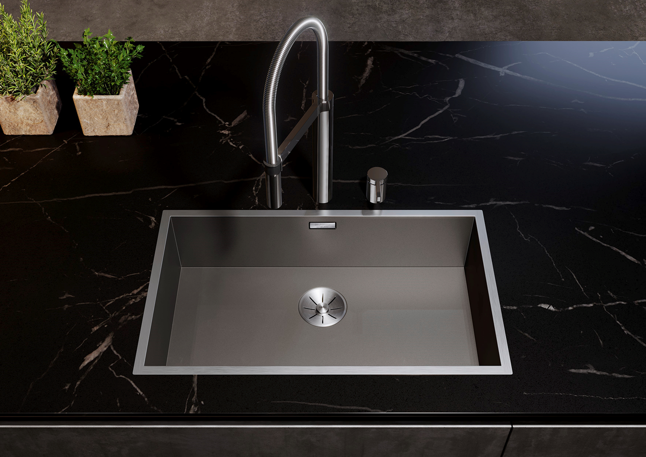 Uitgesproken rechthoekige spoelbak uit roestvrij staal met elegante, donkergrijze oppervlakken