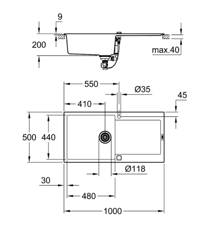 Inclusief afvalset met excentrische bediening, bediening via draaiknop