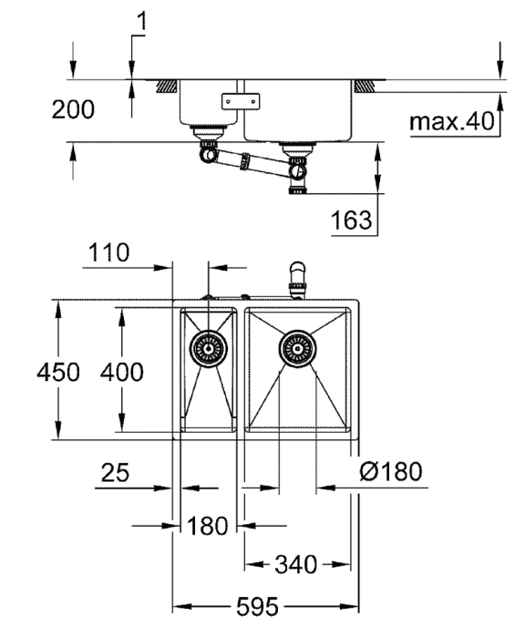 Wastafel links (B x D): 18 x 40 cm, binnendiepte: 16 cm