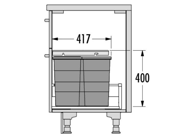Inbouwmaten (bxdxh): 562-568 x 417 x 400 mm. Inhoud: 54 liter, emmers: 1 x 28 liter en 2 x 13 liter (waarvaan 1 met deksel) . Met uitschuifbaar multi-functie kunststof deksel.