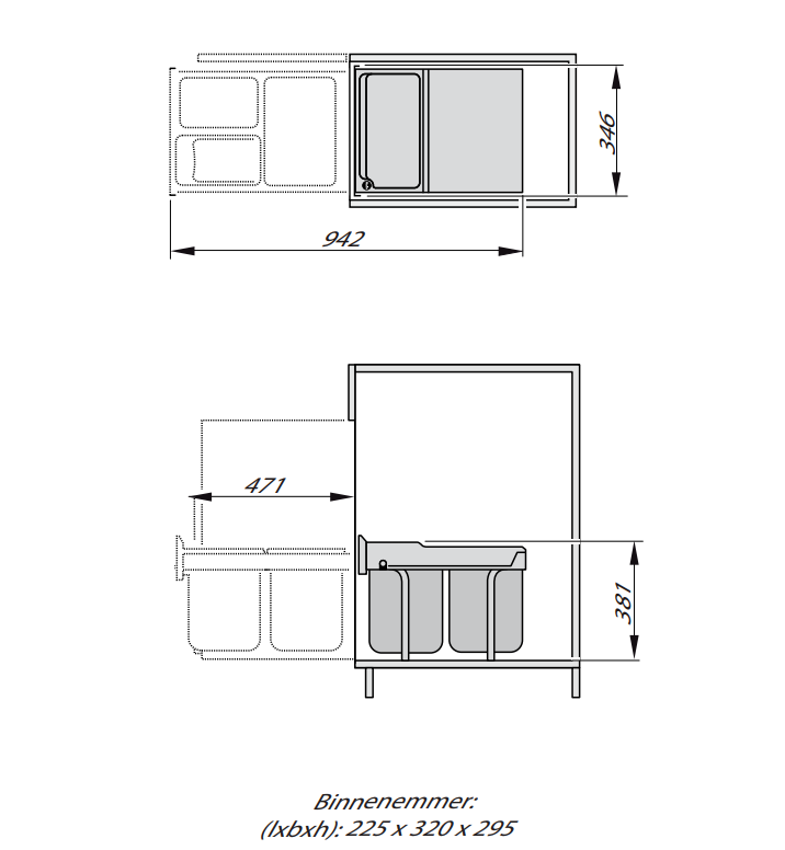 3641-22 (40 ltr.) Inbouwmaten (bxdxh): 346 x 471 x 381 mm. Extra laag, ruimtebesparend model