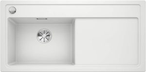 Zwarte quartz spoelbak met afdruipgedeelte en ronde korfplug.
