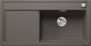 Zwarte quartz spoelbak met afdruipgedeelte en ronde korfplug.