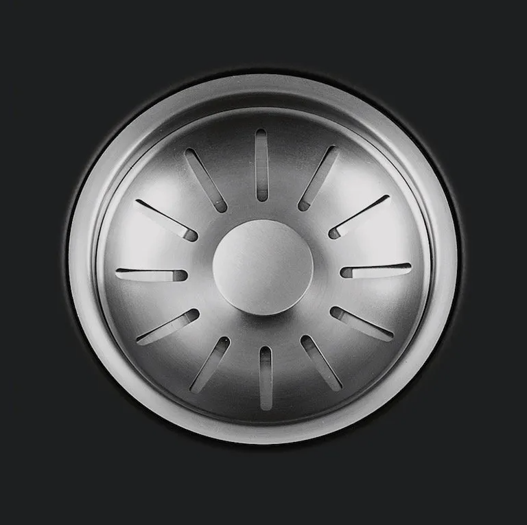 Zwarte quartz spoelbak met ronde korfplug.