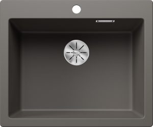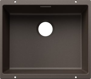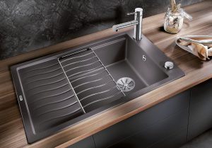 Zwarte quartz spoelbak met ronde korfplug.
