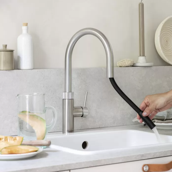 Met de Quooker Flex in combinatie met de CUBE en Combi haalt u een ware alleskunner in huis. Dankzij de flexibele uittrekslang bereikt u iedere plek in uw wasbak. Met de nieuwe Quooker CUBE heeft u naast koud, warm en kokend water nu ook gekoeld gefilterd en bruisend water. Allemaal uit één kraan. Kortom. de Quooker Combi-CUBE Flex RVS is een multifunctionele kraan die ervoor zorgt dat u van alle gemakken voorzien bent. Naast RVS is de Flex ook beschikbaar in Chroom en Zwart.