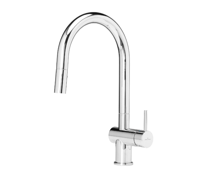 • De chroom variant van de Flint kraan van Reginox is 385 mm hoog en voorzien van een uittrekbare uitloop