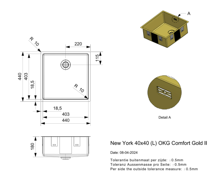 HomeCombi Deals Reginox New York R38734 (L) OKG Comfort Gold II Luxe Enkele Keukenspoelbak Goud 40 x 40 Onderbouw – Vlakbouw – Opbouw