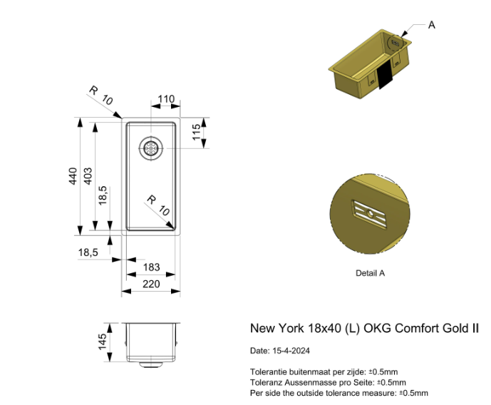 Reginox New York R39359 (L) OKG Comfort Gold II Luxe Enkele Keukenspoelbak Goud 34 x 40 Onderbouw – Vlakbouw – Opbouw €625.00 Oorspronkelijke prijs was: €625.00.€485.00Huidige prijs is: €485.00. incl. btw