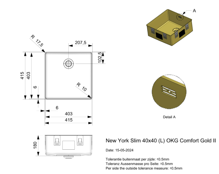 Reginox New York Slim R39557 (L) OKG Comfort Gold II Luxe Enkele Keukenspoelbak Goud 50 x 40 Speciaal Voor Vlakbouw €925.00 Oorspronkelijke prijs was: €925.00.€725.00Huidige prijs is: €725.00. incl. btw