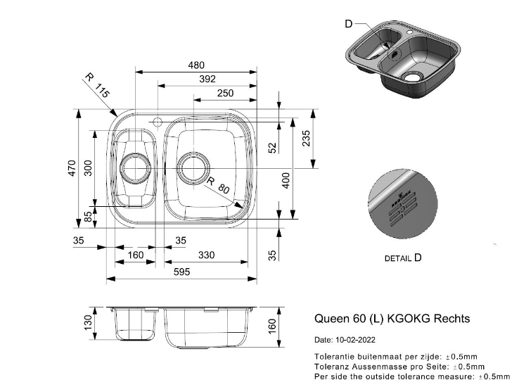 Reginox Queen 60 KGOKG R16725 Anderhalve Keukenspoelbak Links RVS Inclusief Restenbak Vlakbouw Of Opbouw