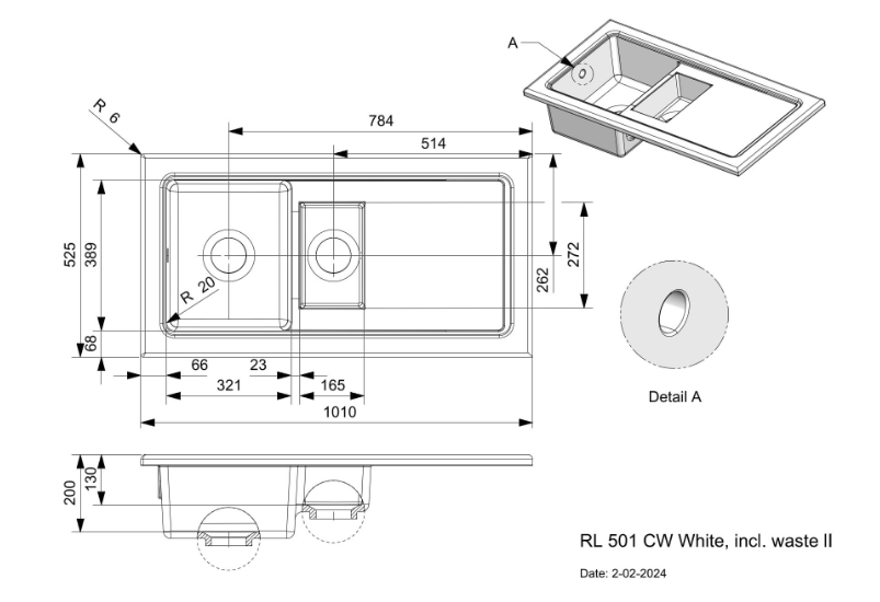 Afmeting spoelbak: 389 x 321 / 165 x 272 mm