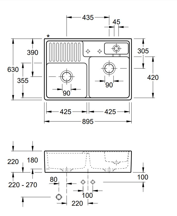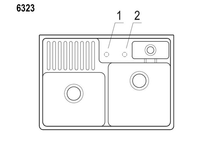 Let op met bestellen van deze spoelbak gelieve in de opmerkingen aangeven hoeveel kraangaten u wenst en welke positie aan de hand van de tekening